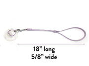 Grooming loop is made of waterproof Biothane. It is 18" from tip-of-clip to tip-of-loop, 5/8" wide, and adjusts to fit most small to large sized dogs. Can accommodate dogs with necks up to 24".