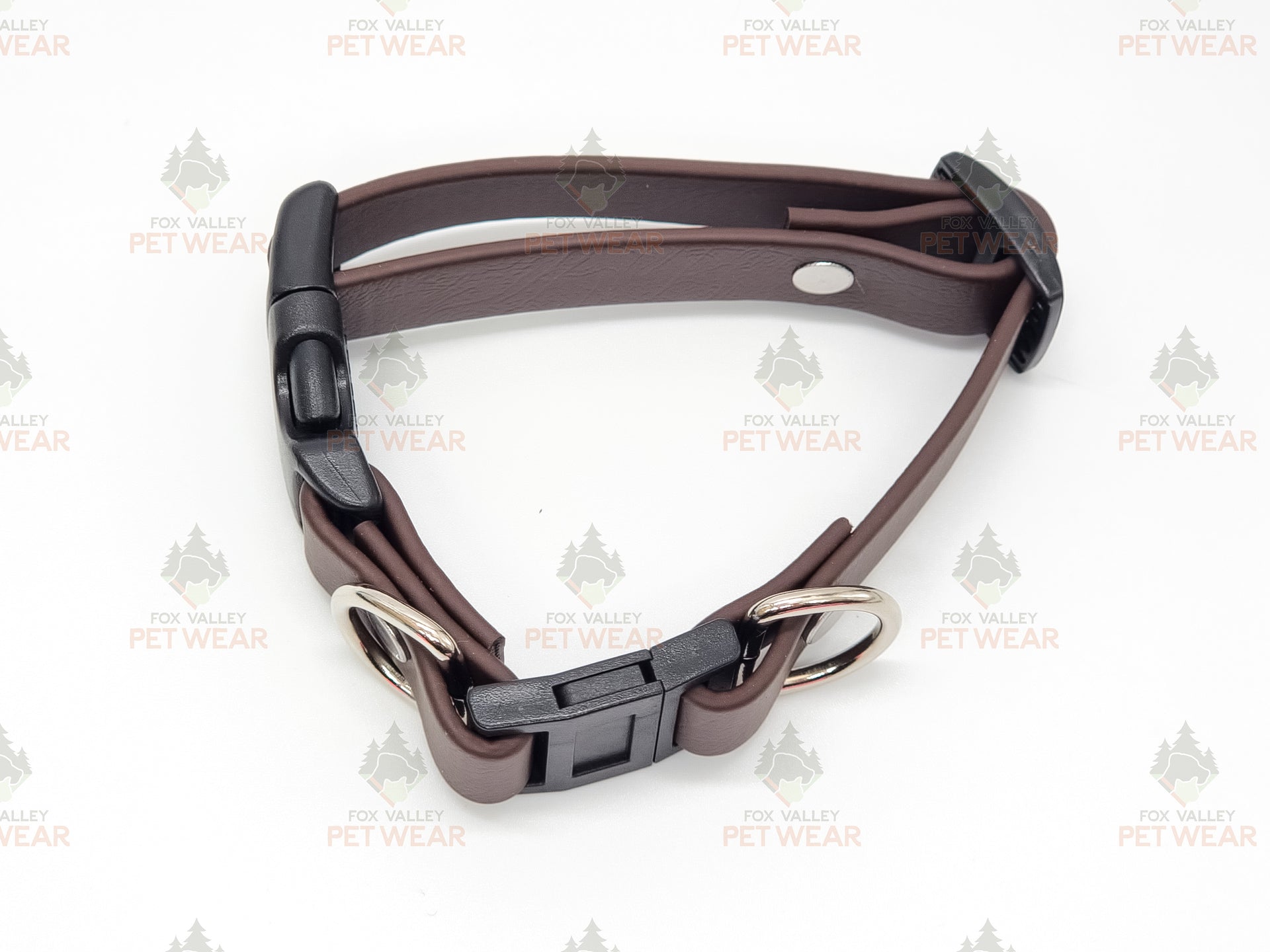 Fox Valley Pet Wear breakaway collars come with a proprietary buckle reinforcement to prevent accidental breakaways more common with larger or heavier dogs (collar lengths of 13" and over only). Buckle reinforcements are removable, replaceable, and adjustable - instructions are included with purchase.