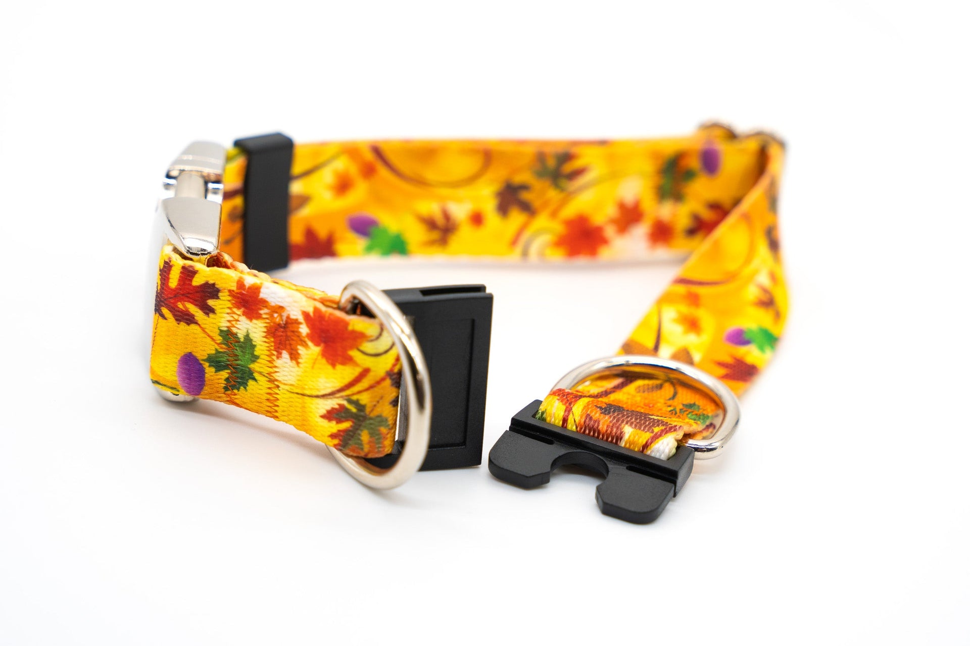 Breakaway buckles or breakaway clasps will pop open with a certain amount of force and do not require a human to do so. Breakaway clasps are ideal for unsupervised activities. Use with a leash requires the leash clip to be clipped to both D-rings to bypass the breakaway feature. Failure to secure both D-rings on a leash or tie out will result in the collar falling off and the dog getting loose.