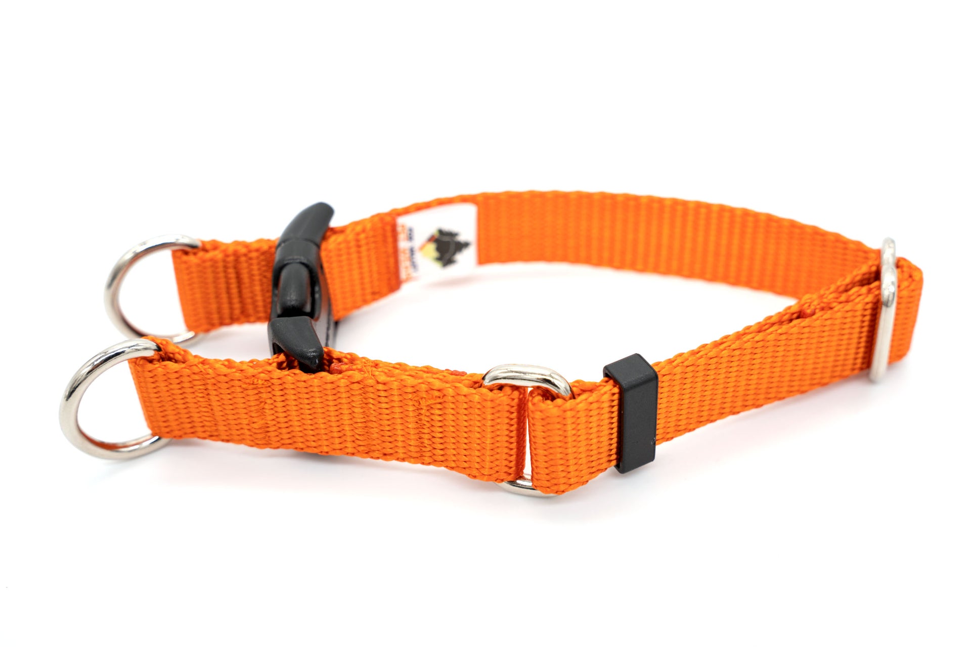 Breakaway buckles or breakaway clasps will pop open with a certain amount of force and do not require a human to do so. Breakaway clasps are ideal for unsupervised activities. Use with a leash requires the leash clip to be clipped to both D-rings to bypass the breakaway feature. Failure to secure both D-rings on a leash or tie out will result in the collar falling off and the dog getting loose.