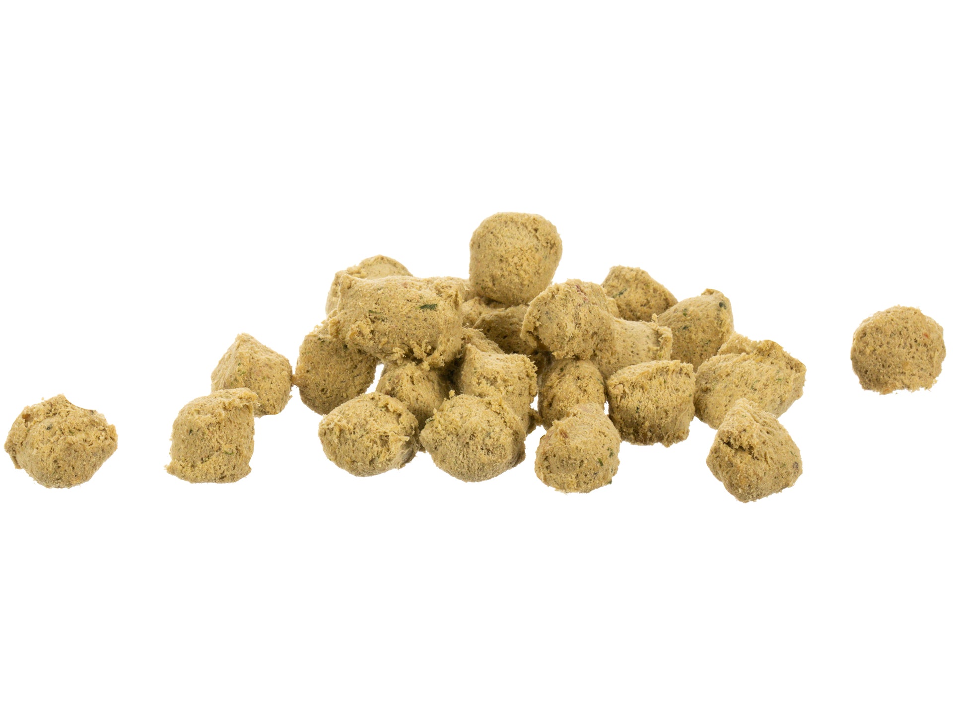 Could a treat be any healthier? Let’s see: these nutrition bombs combine protein-packed duck, fiber-rich, beta-carotene-loaded sweet potatoes and carrots, superfood blueberries and kale, probiotic goat milk—and nothing else. And then they’re freeze-dried so not a single sliver of nutrition is lost.
