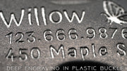 New in 2025, we have expanded our engraving services to plastic buckles! Plastic engraving is nearly indestructible. We paint-fill plastic buckles to give a high-contrast finish, but even if the paint-fill wears out, the engraving into the buckle is permanent.