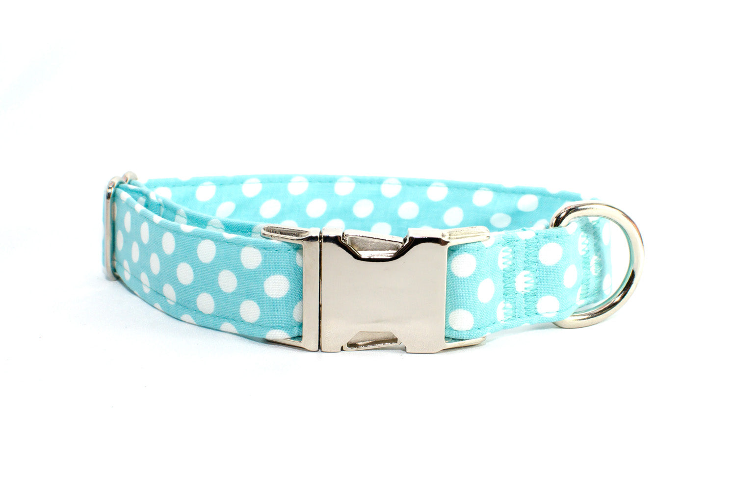 Aqua with White Polka Dots Adjustable Dog Collar with optional personalized, engraved buckle.