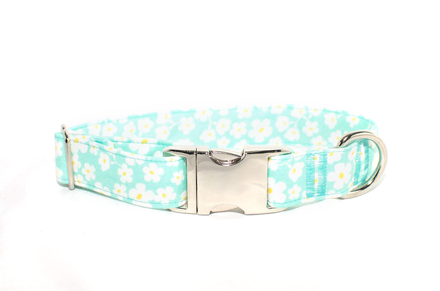 Spring Floral Aqua Adjustable Dog Collar with optional personalized, engraved buckle.