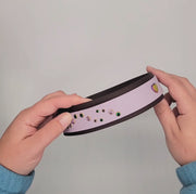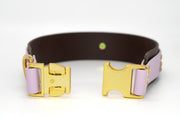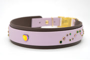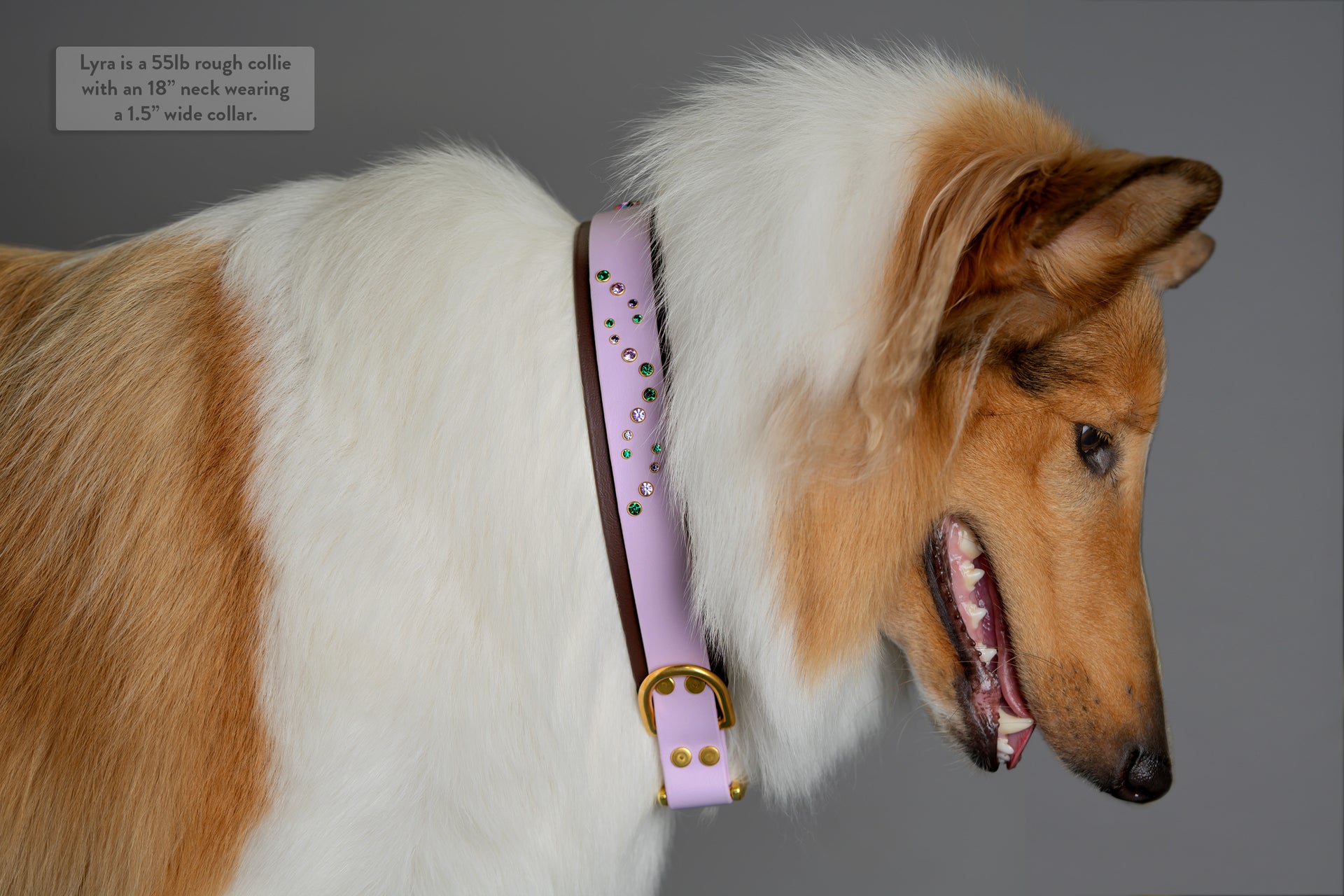 Named for the fuzzy pup I had in mind when I designed it, the "Lyra" collar features lavender Biothane topper with a chocolate Biothane base for the ultimate padded comfort. Tanzanite and Green Zircon crystals in gold settings adorn either side of the collar, with a rainbow heart screw holding things together at the center. With brass hardware throughout, this collar will turn heads!