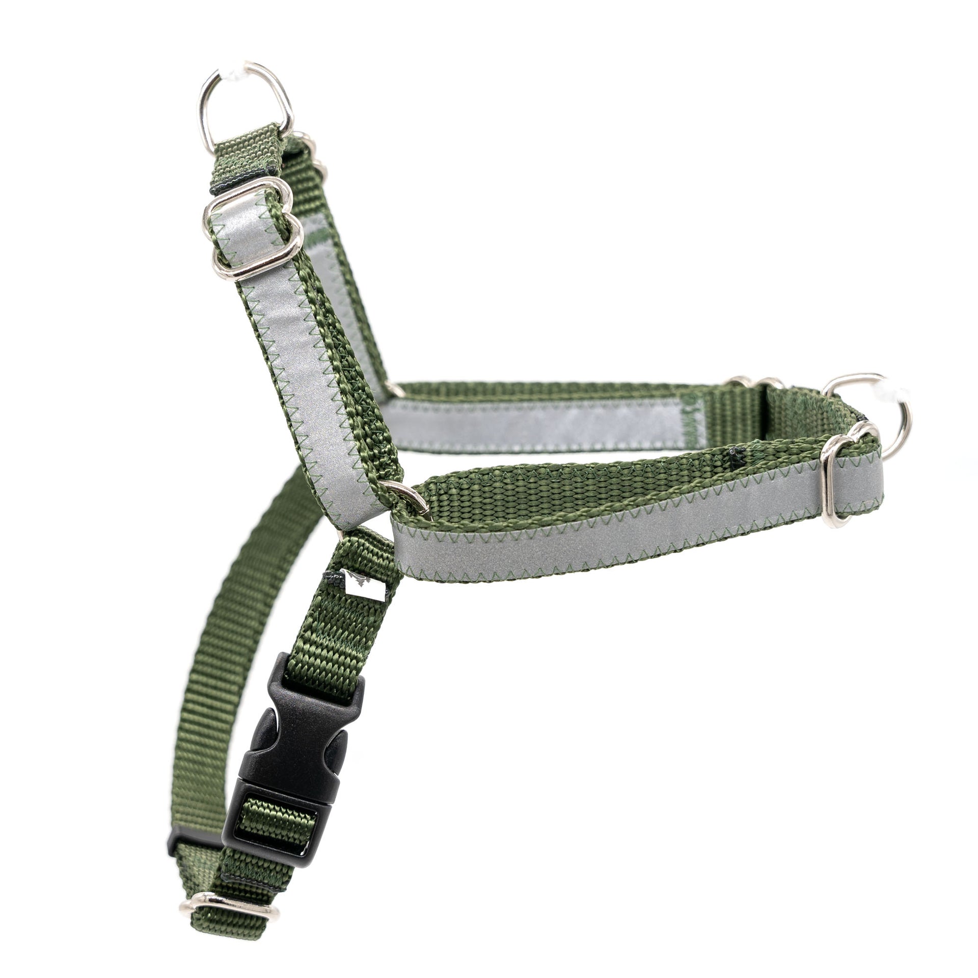 Adjustable Dual-Attach No-Pull Harness™ and optional Scotchlite 3M reflective stripe sewn onto heavy duty nylon webbing. Attach your leash at the dog's chest, at the dog's back, or both! Purchase one of our dual-attach leashes for the ultimate secure walking and training system.