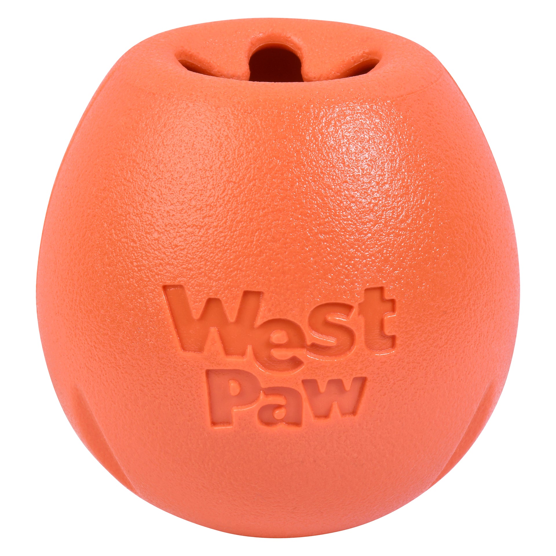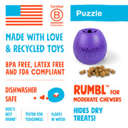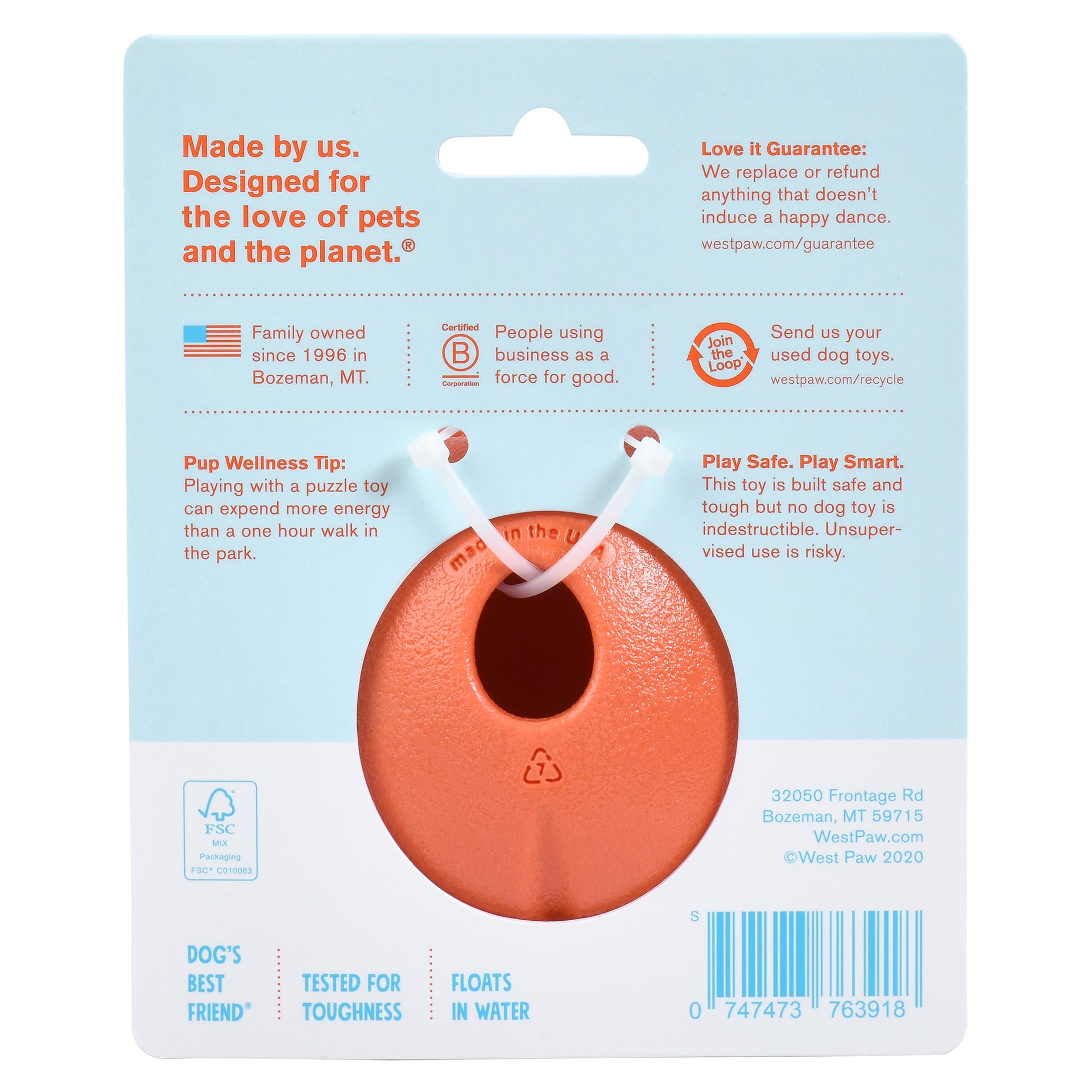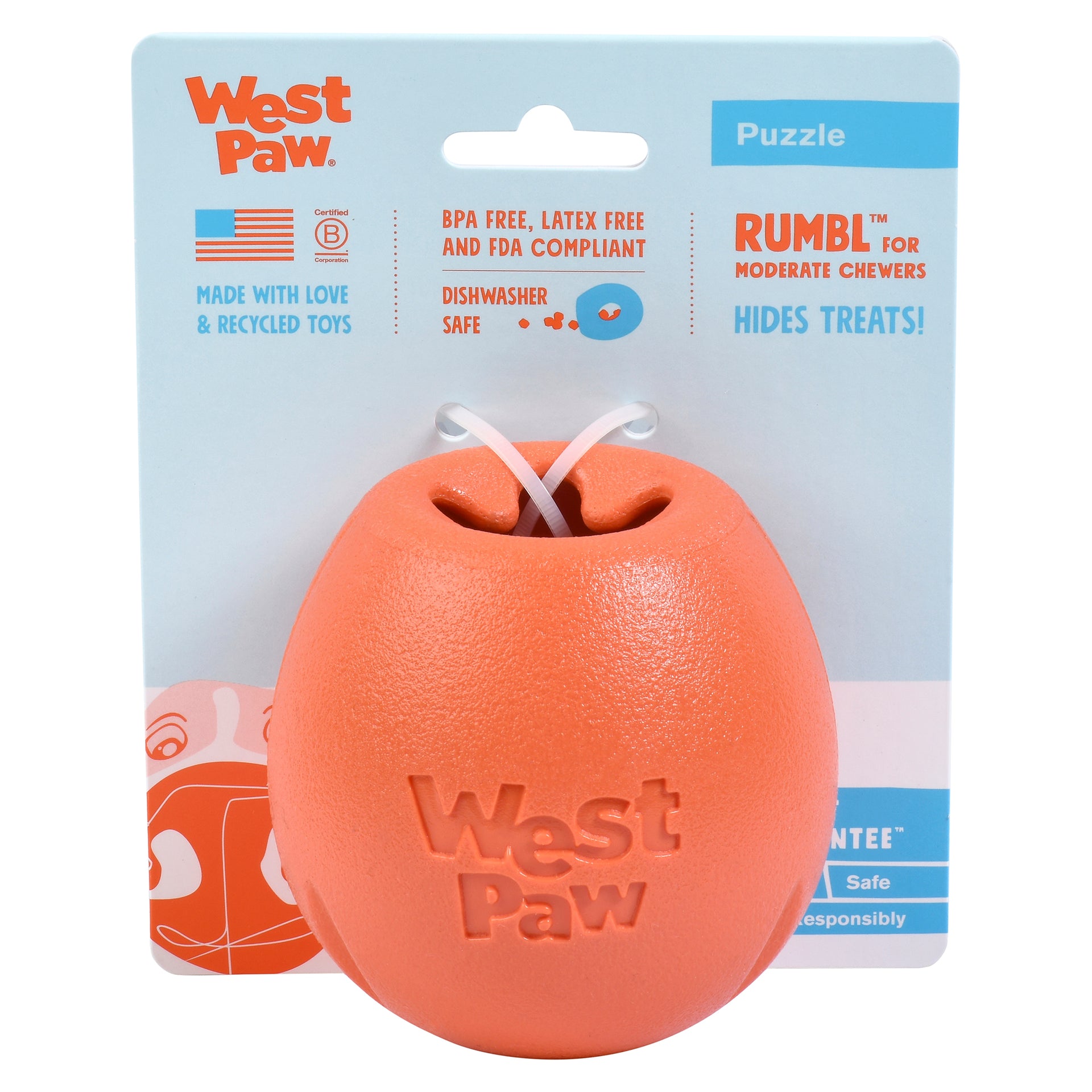 Super bouncy and crazy fun, West Paw’s dry treat-dispensing, puzzle dog toy, Rumbl, encourages healthy play. Rumbl's unique “fish trap” opening makes for easy loading, yet keeps dry food inside. Superior durability and hollow construction make this puzzle toy’s springy material heaven to a dog’s chompers while its playful wobble adds to the excitement and increases engagement.its. Once treats are long gone, Tux floats, bounces, and hangs tough through serious chew sessions.