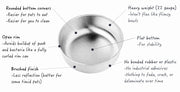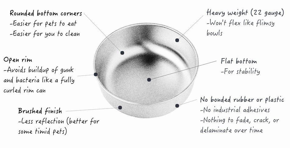 Stainless steel is regarded by most to be the best all around material for dog food and water bowls. Stainless steel dog bowls won’t accumulate bacteria or get chewed up like plastic bowls, and they won’t chip, crack, or shatter like glass or ceramic bowls. Not all stainless steel is created equal, though. In fact, there are hundreds of different grades of stainless steel, and while some types make great mufflers or appliance faces, not all types make great pet bowls. That’s why we use only 304 series (also known as 18/8) stainless steel for our dog bowls.
