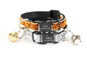 Fun, sparkly cat collar with a breakaway safety buckle, adjustable fit, & available in 3 sizes to fit any feline! Collars are 3/8" wide and and have a black nylon webbing base.